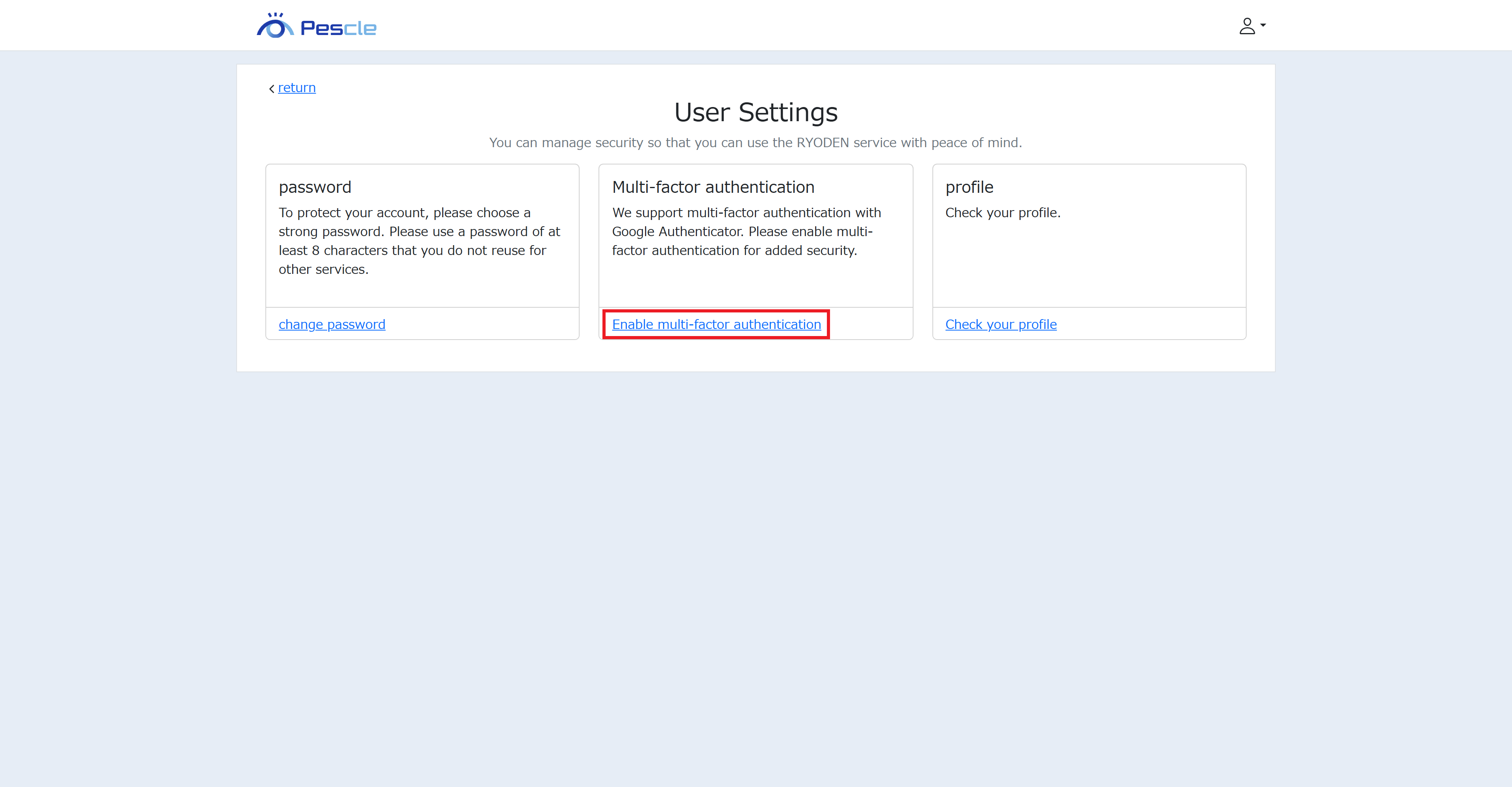 When the user settings screen appears, click “Enable Multi-Factor Authentication.”