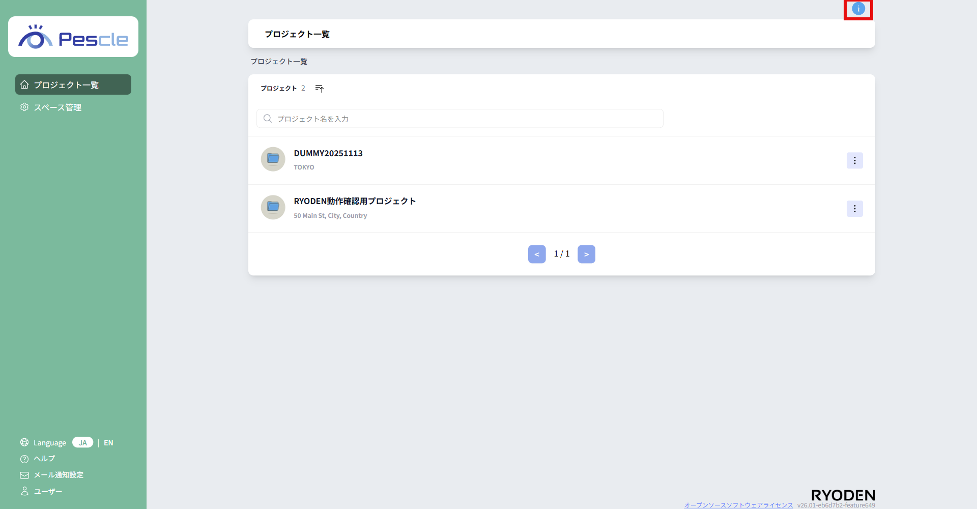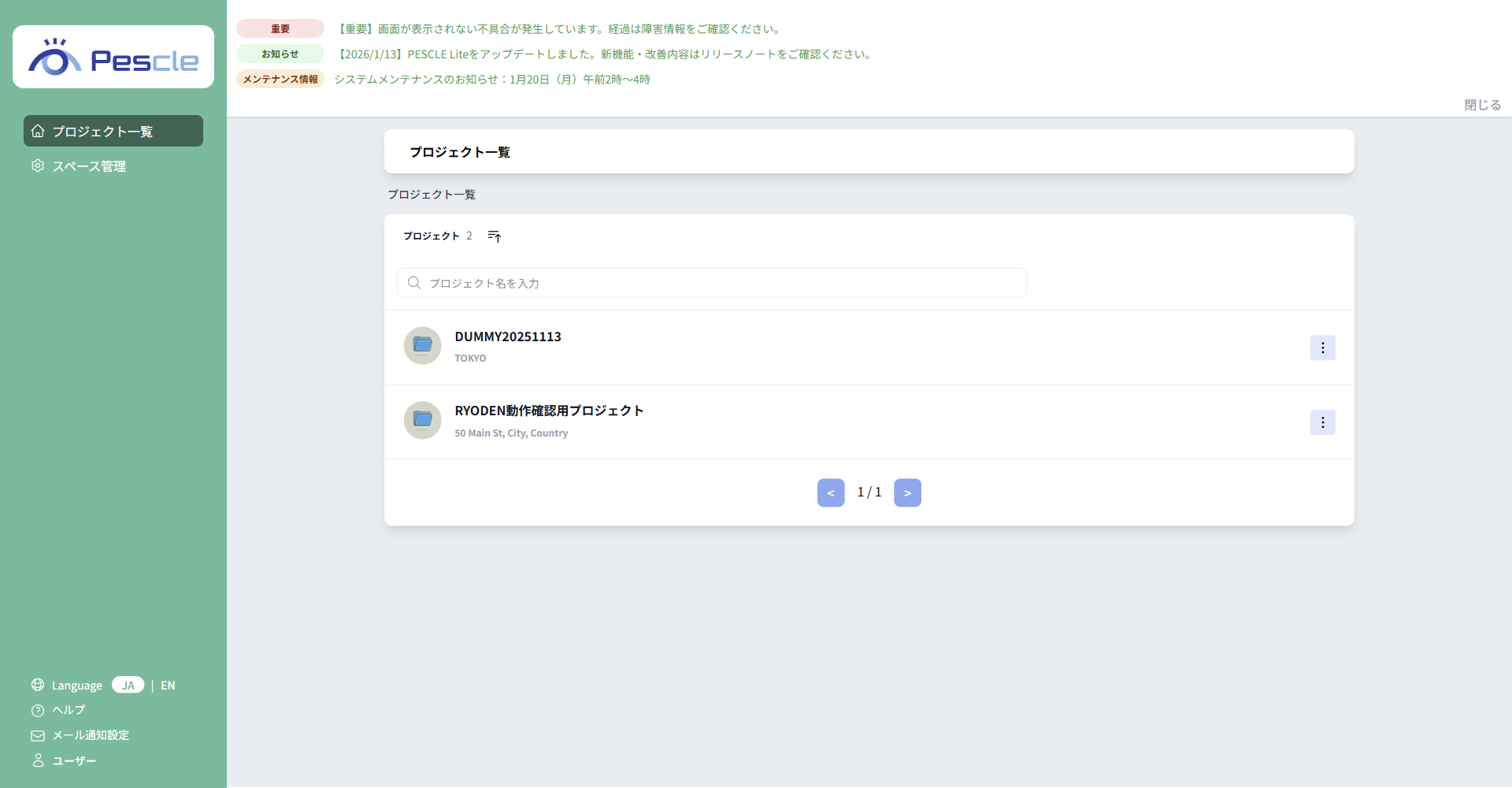 プロジェクト一覧画面では、お客様へのご案内を表示することがあります。