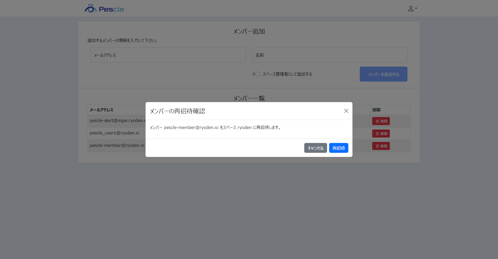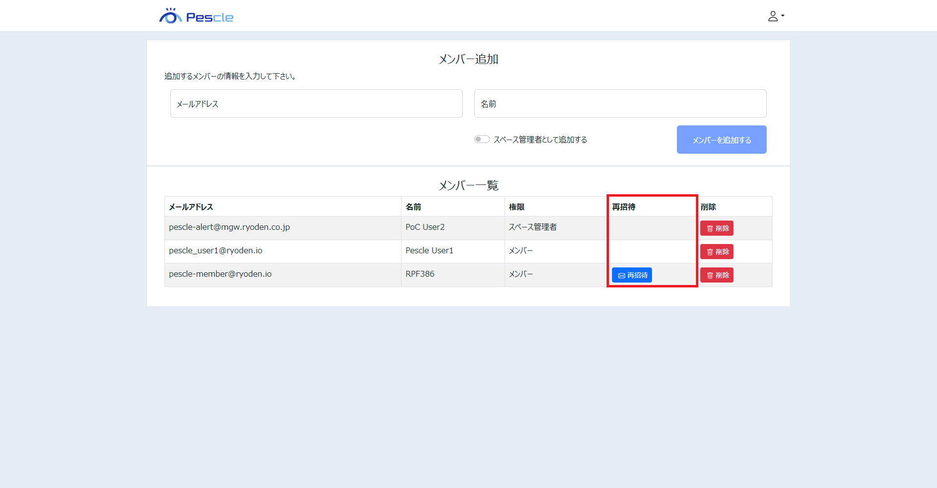 メンバーのメールアドレスを確認して「再招待」ボタンをクリックしてください。