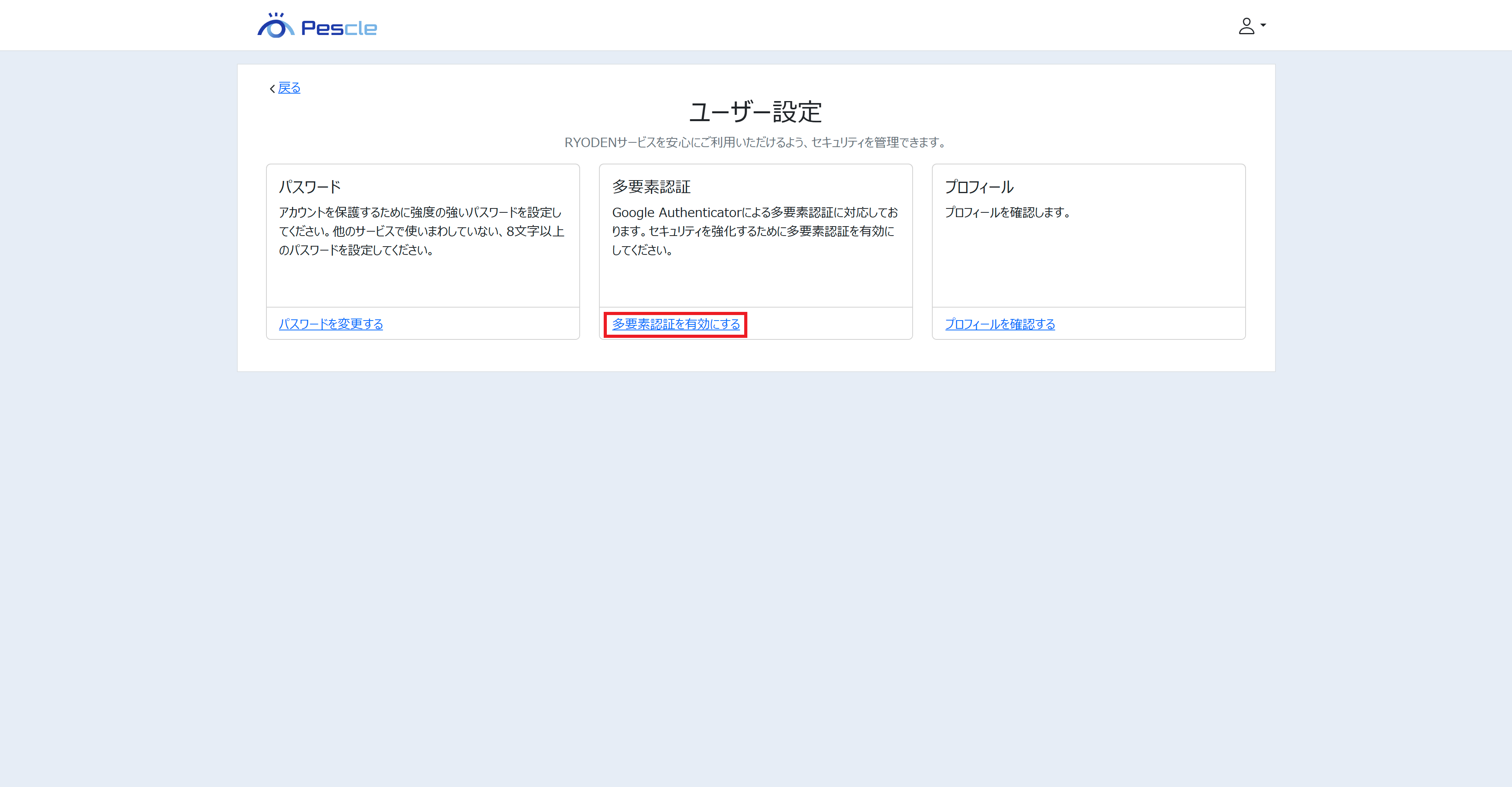 ユーザー設定画面が表示されたら「多要素認証を有効にする」をクリックします。